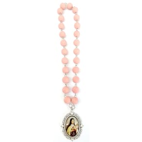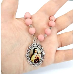 Terço de Santa Terezinha do Menino Jesus com 24 contas. Este é o terço tradicional das rosas de Santa Terezinha. Confeccionado manualmente com pérolas emborrachadas de 10mm na cor rosa. Medalha de Santa Terezinha em banho de prata cravejada de Strass medindo 4,0 cm de altura e 3,0 cm de largura. Medida do terço esticado: 20 cm aproximadamente . O terço é acomodado em embalagem de veludo. Marca: Evangelize