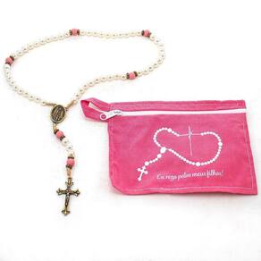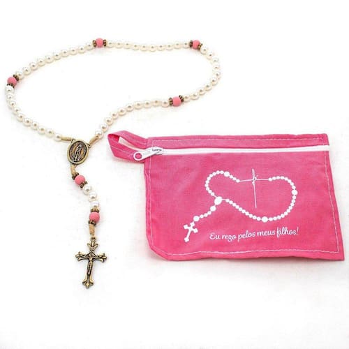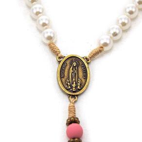Terço Nossa Senhora de Fatima Perolas Plástico 8mm Rosa Nossa Senhora de Fátima, é o um título de Maria Mãe de Jesus, a sua aparição em Fátima Portugal , a três pastorinhos, Lúcia, Francisco e Jacinta. Material: Contas em pérola Plastico 8mm Entremeios em plástico fosco 8mm Metais em ouro velho Cordão Tamanho: 35 cm de comprimento Embalagem: Saquinho de tecido Dimensões aproximadas do produto. Marca: Amém Decoração Religiosa Ean: 7899347276192