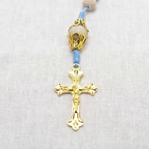 Material: contas em madeira branca e azul 8 mm