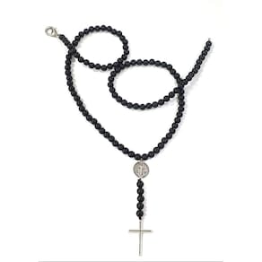 Terço Rosso Cruz / São Bento 6Mm Black Terço rosso Cruz com risco centro São bento em pé Gomos 6mm black Material: aço inoxidável cirúrgico, antialérgico. Acompanha: embalagem e certificado rosso Peso: 42 gramas Medidas corrente: comprimento 68 cm /espessura 0.5mm Medidas pingente: altura 1.0mm /largura 2 cm Cor: prata -fácil manutenção -não amassa;