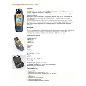 Termo Higro Anemômetro Digital 3 Em 1 + Maleta para Transporte O termo-higroanemômetro é utilizado para verificação de condicionadores de ar, sistemas de aquecimento e em áreas externas, assim como na meteorologia, na criação de animais e na agricultura para verificação das condições climáticas para aplicação de defensivos químicos. Para facilitar o transporte e a utilização em campo, fornecemos junto com o termo-higroanemômetro uma linda maleta de transporte para você poder carregar o equipamento para onde necessitar com muita segurança ======================================================================= O Termo-Higroanemômetro Digital AK821 é robusto e compacto, porém, combina três instrumentos em um só produto: Termômetro; Higrômetro; Anemômetro. Realiza medições de temperatura e umidade ambientes, velocidade do ar, além de indicar o ponto de orvalho. Além disso, registra as máximas e mínimas das medições ativas no seu amplo display de LCD, que conta com iluminação backlight , facilitando a leitura em lugares com baixa luminosidade ======================================================================= INFORMAÇÕES TÉCNICAS: Faixa de medição: 0.4 a 20 m/s -10 a 50C 0 a 100%UR Resolução: 0.1 m/s 0.1C 0.1%UR Exatidão: 2% da leitura + 0.3 m/s 1C 3%UR Dimensões: 157 x 60 x 30 mm Peso: 180g Temperatura de operação: -10 a 50C Umidade de operação: 10 a 90%UR sem condensação Alimentação: 4.5V 3 pilhas AAA ======================================================================= Funções adicionais: - Seleção C/F - Indicação do ponto de orvalho em C/F - Realiza medições em m/s, km/h, fpm, mph, kts, Beaufort - Registro de máxima e mínima - Função HOLD - Iluminação do visor backlight - Indicação de bateria fraca - Desligamento automático após 20 minutos ======================================================================= Acessórios Inclusos: - 3 pilhas AAA - Maleta para transporte - Alça de mão - Manual de instruções ======================================================================= Clique no botão Comprar agora para garantir Termo Higro Anemômetro Digital + Maleta para Transporte pelo melhor preço =======================================================================