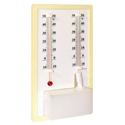Termo-Higrômetro Analógico Bulbo Seco E Úmido 519503000 Termo-higrômetro com dois termômetros escala externa, bulbo seco e úmido. Para monitoramento de umidade relativo do ambiente. Enchimento ecológico. Base plástica. Diferenciais do produto Instrumentos desenvolvidos para determinar a umidade relativa em diversoso ambientes, tais como: depósitos, estoques, áreas de produção, laboratórios, entre outros. Informações técnicas Escala: -10°c à +50°c; Divisão: 1°c; Comprimento: 190 x 106mm; Enchimento: líquido; Limite de erro: ±1°c; Peso: 90g; Marca: Não Informado