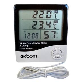 Escala de medição interna: -10ºC até 50ºC -14ºF até 122ºF Escala de medição externa: -50 a 70C -58ºF até 158ºF Precisão de medida: +- 1ºC 1,8ºF Resolução de temperatura: +- 0,1ºC 0,2ºF Faixa de medição de umidade: 20% até 99% RH Precisão de umidade: +- 5% RH Resolução de umidade: 1% Unidade de temperatura em ºC e ºF Memória de temperatura máxima, mínima e umidade Relógio, despertador e data Aviso de horas Alimentação: 1 Pliha AAA 1,5v inclusa Dimensões aproximadas do produto: 98 x 106 x 23 mm LxAxP Comprimento do sensor: 1,5 m