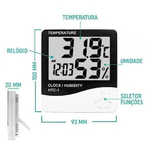 O Medidor Umidade Temperatura Relógio Digital Higrômetro é um aparelho prático e fácil de usar para medir a temperatura e umidade ambiente em tempo real. Além disso, possui a função de relógio e calendário, tornando-o versátil e funcional. Com este medidor, você poderá medir a temperatura em graus Celsius ou Fahrenheit, de -10°C a +50°C, com uma precisão de 1°C 1.8ºF e uma resolução de 0.1°C 1.2ºF . A medição da umidade é feita na faixa de 10% a 90% RH, com uma precisão de 5% RH e uma resolução de 1%. O Medidor Umidade Temperatura Relógio Digital Higrômetro possui memória para armazenar as medições máximas e mínimas, permitindo que você acompanhe as variações ao longo do tempo. Seu visor de fácil visualização facilita a leitura das informações disponibilizadas. Feito em material ABS de alta qualidade, este medidor é durável e resistente. Ele funciona com uma bateria AAA 1.5V , que já está inclusa na embalagem, garantindo seu funcionamento imediato. Com design compacto e versátil, o Medidor Umidade Temperatura Relógio Digital Higrômetro pode ser Utilizado tanto em uma parede quanto em uma mesa, se adaptando às suas necessidades. Seu funcionamento é simples e intuitivo, tornando-o ideal para uso doméstico, em escritórios, salas de aula, laboratórios e diversos outros ambientes. Na embalagem, você receberá 1x Termo-Higrômetro e 1x pilha AAA, para que você possa começar a utiliza-lo imediatamente. Não perca a oportunidade de adquirir o Medidor Umidade Temperatura Relógio Digital Higrômetro e tenha sempre o controle da temperatura e umidade ao seu alcance. Marca: Weimports