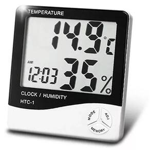 Medidor de temperatura, Umidade relativa do ar e relógio despertador. Elegante, com painel de LCD.