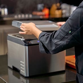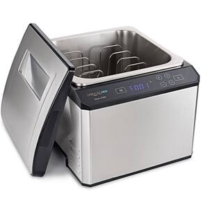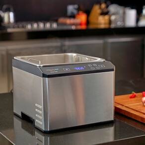 Termocirculador Sous Vide 9 litros Selovac NEO SV9L. Ideal para restaurantes, padarias, açougues e similares. Indicado para cozinhar em temperatura controlada, garantindo o ponto exato de preparo, preservando nutrientes e intensificando sabores. Sistema preciso de circulação de água que garante o cozimento uniforme. Painel intuitivo com display. Estrutura e tampa em em aço inoxidável (AISI 304) e plástico resistente e cuba em aço inoxidável. Tampa com proteção anti-queimadura. CAPACIDADE: 9L. TEMPERATURA: 30°C - 90°C. TEMPO DE COZIMENTO: 0 - 99h. CONSUMO: 2kW/h. POTÊNCIA: 2000W. PESO: 5,2kg. DIMENSÕES(CxAxL): 34x28x32cm. Termocirculador Sous Vide 9 litros Selovac NEO SV9L é na Atau. Marca: Não Informado