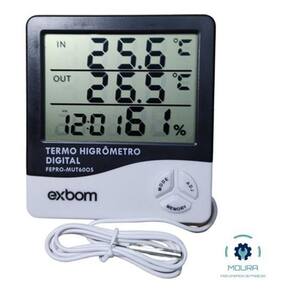 Escala de medição interna: -10ºC até 50ºC -14ºF até 122ºF Escala de medição externa: -50 a 70C -58ºF até 158ºF Precisão de medida: +- 1ºC 1,8ºF Resolução de temperatura: +- 0,1ºC 0,2ºF Faixa de medição de umidade: 20% até 99% RH Precisão de umidade: +- 5% RH Resolução de umidade: 1% Unidade de temperatura em ºC e ºF Memória de temperatura máxima, mínima e umidade Relógio, despertador e data Aviso de horas Alimentação: 1 Pliha AAA 1,5v inclusa Dimensões aproximadas do produto: 98 x 106 x 23 mm LxAxP Comprimento do sensor: 1,5 m