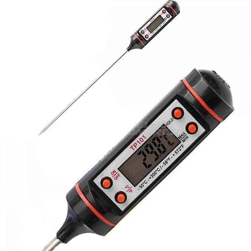 Mede a temperatura de alimento em graus célsius e fahrenheit com extrema precisão e rapidez. Perfeito para medir a temperatura de prato em banho maria no forno e outros. Seu display em LCD facilita a visualização das informações de modo claro e nítido junto de seu material de alta durabilidade e resistência que garante uma vida útil muito mais longa e durável para o produto.