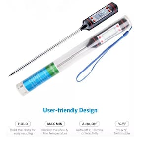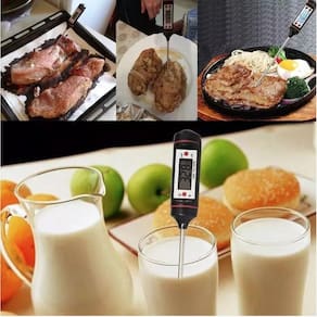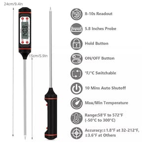 Termômetro ideal para uso em casa na cozinha, no churrasco, no restaurante, frutos do mar, termômetro ira garantir que seu alimento fique na temperatura ideal, cozido ou assado perfeitamente, utilizados para medir a temperatura de carnes de pequeno, médio e grandes portes. Algumas recomendações, medição de Chá, Assados, Pães, Café, Cobertura de Chocolate, Cerveja, Ponto da Carne, Sopas, Caramelo, Caldas, Molhos, Óleo, Água do Aquário, Líquidos em Geral, Churrasco, etc