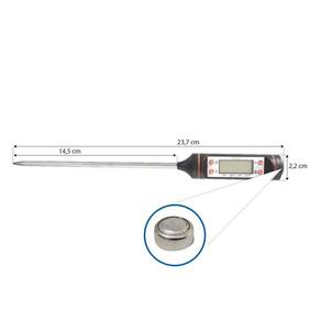 Este termômetro é tipo espeto e conta com uma ponta de prova ou haste em aço inox com terminal pontiagudo de 14,5 cm que serve tanto para alcançar o fundo de recipientes quanto para perfurar objetos sólidos, efetuando assim a medição.