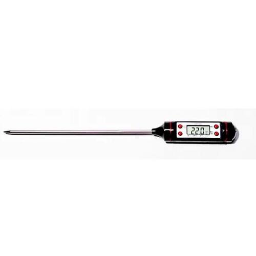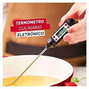 Termômetro Digital Culinário Sobre o produto: Termômetro Culinário Digital Liquido Alimento Cozinha Clink Alimentos queimados, secos, sem suculência , muito quente ou muito frio NUNCA mais, use para cozinhar, verificar a temperatura correta de líquidos e de alimentos sólidos. O termômetro culinário é uma ferramenta de medição muito útil usada para medir a temperatura interna de alimentos como carne, assados e líquidos, ou outros alimentos cozidos. Pode detectar temperaturas precisas. Especificações: Termômetro Culinário Digital Espeto Alimentos Cozinha - Mede de -50ºC a +300ºC- Escala: 0,1 ºC- Bateria 1,5V AG13 Inclusa - Tamanho: 23cm- Modo de economia de energia: desliga automaticamente após 10 minutos sem uso. principais botões:- Ligar/desligar, centígrados/Fahrenheit e Função Hold Fixa última medição - Memória da última medição- Desligamento automático para economia de energia Instruções 1- Pressione o Botão Hold para fixar a temperatura quando estiver medindo e pressione novamente para iniciar uma nova medição.2 - Pressione ºC e ºF para selecionar a escala que deseja utilizar.3 - On/Off - Liga e desliga o aparelho4 - Max/Min. Mostra a maior e a menor temperatura medida. Itens Incluso: 01 Termômetro Culinário