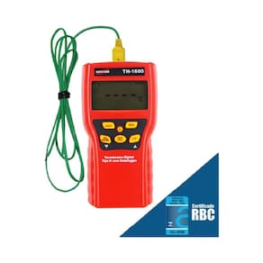TERMÔMETRO TIPO-K COM DATALOGGER MANUAL MOD. TH-1600 DE 1 CANAL COM FUNÇÃO HOLD, MÁX/MÍN E TEMPERATURA RELATIVA COM CERTIFICADO DE CALIBRAÇÃO ACREDITADA RBC DESCRIÇÃO: Equipamento portátil de fácil utilização, com funções HOLD, datalogger manual, Máx/Min, duas unidades de medição de tem DESTAQUES: Função datalogger manual, botão HOLD, temperatura em °C e °F, função Máx/Min, Exibição de Temp. Relativa APLICAÇÕES: Instrumento utilizado para medições de superfícies, quentes ou frias, gases, líquidos, semi sólidos, temperatura ambiente e metais fundidos (Sensor opcional) DESCRIÇÃO CERTIFICADO CALIBRAÇÃO: Certificado de Calibração RBC P/ Termômetro 1 Canal com Sensor Termopar e outros Sensores sob Procedimento PCI-081 faixa de -25 a 400ºC em 3 Pontos Distribuídos Conforme Escopo Calibração acreditada RBC Procedência: Laboratório de Calibração Instrutherm ESPECIFICAÇÕES TÉCNICAS: Faixa de medição: -200 ~ 1370ºC (-328 ~ 2498ºF) Sensor tipo K que acompanha -60 a 200°C (-76 ~ 392ºF) Display, leitura máxima de 2498 contagens. Indicação de Bateria fraca Equipamento utiliza sensor termopar tipo K atendendo a norma IEC458 Duração da Bateria de aproximadamente 500h de uso contínuo Temperatura de armazenamento -10°C ~ 60°C (10°F ~ 140°F) Função Máx/Min Função HOLD Função temperatura relativa Datalogger Manual Temperatura de operação: 0°C ~ 50°C (32°F ~ 122°F) Umidade de operação: 0% ~ 90% (0°C ~ 35°C) Alimentação: DC60V ou AC24V Peso: 115,5g Dimensões: 350 x 770 x 1460mm ACESSÓRIOS FORNECIDOS: Sensor tipo-K de uso geral Bateria 9V Manual de instruções Certificado de calibração acreditada rbc