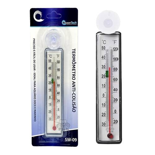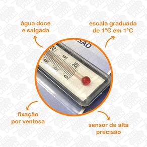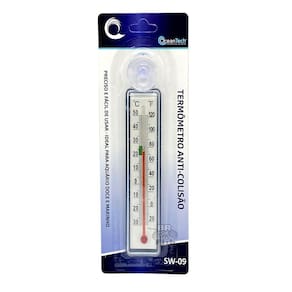 Principais Características: Termômetro equipado com sensor de alta precisão; Termômetro de plástico resistente para aquários e terrários; Também é possível utilizá-lo em outras superfícies lisas para averiguar a temperatura da água; Modelo com fixação por ventosa totalmente submerso; Monitora temperaturas até 50C; Pode ser utilizado em aquários de água Doce e aquários Marinhos; Equipado com materiais de alta qualidade, garantindo uma fantástica resistência anti colisão; Escala graduada de 1C em 1C; Ideal para garantir o ambiente perfeito para os animais; Por ser anti colisão, é uma excelente opção para ser utilizado em aquaterrário; Mede tanto em Celsius quanto em Fahrenheit.