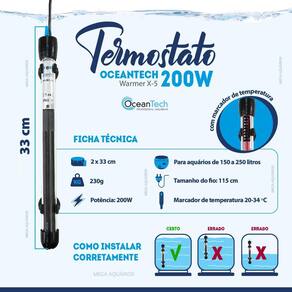 Termostato com aquecedor OceanTech 200W com marcação de temperatura lago ou aquário de até 250L - acompanha termômetro adesivo Para manter a temperatura estável e o bem-estar dos seus peixes, conte com o melhor equipamento do mercado, os termostatos com aquecedor OceanTech para aquários, são fabricados com materiais de alta qualidade, sua resistência é feita de puro níquel-cromo, que além de não enferrujar, possibilita rápida transferência de calor. Características: Resistência de puro níquel-cromo - não enferruja Tubo de quartzo de alta performance Painel de ajuste de temperatura Botão de controle de temperatura giratório Protetor plástico para a ponta Rápida transferência de calor Operação constante Totalmente submerso e à prova dágua Fácil instalação e manutenção Possui LED que indica quando o aquecedor está ligado Server para aquários de água doce ou marinhos Aquecedor e Termostato automático liga e desliga para atingir a temperatura regulada Compre nesse anúncio diretamente com um revendedor oficial OceanTech. Especificações técnicas: Marca: OceanTech Modelo: Warmer X-5 Potência: 200W Voltagem: escola a voltagem na lateral do anúncio Ajuste de temperatura entre 20ºC a 34ºC Peso: 230g Tamanho: 2 x 33 cm larg x alt Tamanho do fio: 115cm Para aquários de 150 a 250 litros Conteúdo da embalagem 1 termostato com aquecedor 1 protetor de plástico de ponta 2 ventosas para fixação 1 termômetro externo adesivo Nota: Nunca ligue esse equipamento fora da água Se notar qualquer dano no cabo de energia, não utilizar o produto, pois haverá risco de choque elétrico. : 1 ano pelo fabricante, 3 meses pelo revendedor. apenas para defeito de fabricação. Dicas de uso: Use o termostato na vertical Instale-o em local onde há circulação de água Mantenha-o totalmente submerso Antes de ligar o equipamento, verifique a temperatura ideal para a espécie mantida no seu aquário Regular a temperatura desejada por meio do botão giratório. Como instalar o termostato Oceantech Limpe a parte de dentro do aquário onde será fixado o termostato Coloque na posição vertical e fixe com as ventosas no vidro Deixe-o aclimatando por cerca de 15min evitando choque térmico Ligue-o na tomada certifique-se que a voltagem do produto é a mesma da rede . Funcionamento: Sempre que o sensor do equipamento detectar na água uma temperatura abaixo do ajustado no painel, o aquecedor ligará automaticamente, e desligará quanto atingir a temperatura desejada. Manutenção: Realize a limpeza do termostato a cada 30 dias Sempre desligue o equipamento de 15 a 20 minutos antes de retirá-lo do aquário Lave-o em água corrente e não utilize produtos abrasivos. Serve para piscina Não serve. Serve para chocadeira Não serve. Serve para aqua-terrário Não serve. Posso colocar na horizontal O fabricante aconselha apenas uso na vertical. Obrigado pela visita e boas compras ATENÇÃO Nossas imagens e textos são registrados e com direito de uso autoral controlado e reservado a essa loja e as lojas parceiras devidamente autorizadas em contrato. Marca: Não Informado