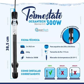 Termostato com aquecedor OceanTech 300W com marcação de temperatura lago ou aquário de até 350L - acompanha termômetro adesivo Para manter a temperatura estável e o bem-estar dos seus peixes, conte com o melhor equipamento do mercado, os termostatos com aquecedor OceanTech para aquários, são fabricados com materiais de alta qualidade, sua resistência é feita de puro níquel-cromo, que além de não enferrujar, possibilita rápida transferência de calor. Características: Resistência de puro níquel-cromo - não enferruja Tubo de quartzo de alta performance Painel de ajuste de temperatura Botão de controle de temperatura giratório Protetor plástico para a ponta Rápida transferência de calor Operação constante Totalmente submerso e à prova dágua Fácil instalação e manutenção Possui LED que indica quando o aquecedor está ligado Server para aquários de água doce ou marinhos Aquecedor e Termostato automático liga e desliga para atingir a temperatura regulada . Compre nesse anúncio diretamente com um revendedor oficial OceanTech. Especificações técnicas: Marca: OceanTech Modelo: Warmer X-5 Potência: 300W Ajuste de temperatura entre 20ºC a 34ºC Peso: 260g Tamanho: 2 x 38,5 cm larg x alt Tamanho do fio: 115cm Para aquários de 250 a 350 litros. Conteúdo da embalagem 1 termostato com aquecedor 1 protetor de plástico de ponta 2 ventosas para fixação 1 termômetro externo adesivo. Nota: Nunca ligue esse equipamento fora da água Se notar qualquer dano no cabo de energia, não utilizar o produto, pois haverá risco de choque elétrico. : 1 ano pelo fabricante, 3 meses pelo revendedor. apenas para defeito de fabricação. Dicas de uso: Use o termostato na vertical Instale-o em local onde há circulação de água Mantenha-o totalmente submerso Antes de ligar o equipamento, verifique a temperatura ideal para a espécie mantida no seu aquário Regular a temperatura desejada por meio do botão giratório. Como instalar o termostato Oceantech Limpe a parte de dentro do aquário onde será fixado o termostato Coloque na posição vertical e fixe com as ventosas no vidro Deixe-o aclimatando por cerca de 15min evitando choque térmico Ligue-o na tomada certifique-se que a voltagem do produto é a mesma da rede . Funcionamento: Sempre que o sensor do equipamento detectar na água uma temperatura abaixo do ajustado no painel, o aquecedor ligará automaticamente, e desligará quanto atingir a temperatura desejada. Manutenção: Realize a limpeza do termostato a cada 30 dias Sempre desligue o equipamento de 15 a 20 minutos antes de retirá-lo do aquário Lave-o em água corrente e não utilize produtos abrasivos. Serve para piscina Não serve. Serve para chocadeira Não serve. Serve para aqua-terrário Não serve. Posso colocar na horizontal O fabricante aconselha apenas uso na vertical. Obrigado pela visita e boas compras ATENÇÃO Nossas imagens e textos são registrados e com direito de uso autoral controlado e reservado a essa loja e as lojas parceiras devidamente autorizadas em contrato. Marca: Não Informado