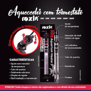 Especificações técnicas: Marca: Roxin Modelo: HT-1300/Q3 100W Produto: Termostato com aquecedor Potência: 100W Ajuste de temperatura entre 22ºC a 34ºC Grau de resistência IP68 Protegido contra a imersão contínua em água até 1,20 metros Peso: 145g Tamanho: 2,3 x 27 cm larg x alt Tamanho do fio: 90cm Para aquários de 50 a 150 litros