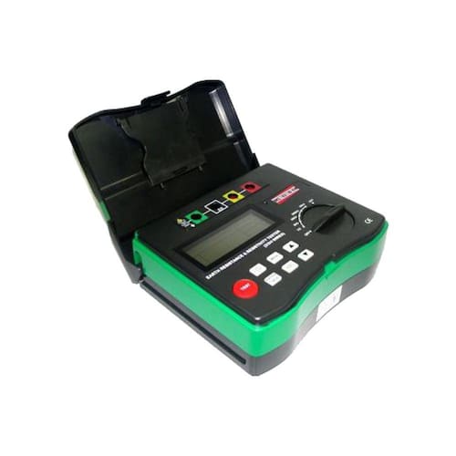 TERRÔMETRO DIGITAL PORTÁTIL, ESCALA DE RESISTENCIA E RESISTIVIDADE, 4 ESTACAS MOD.MRT-1000   DESCRIÇÃO: Terrômetro digital portátil, escala de resistencia e resistividade, 4 estacas mod.mrt-1000   ESPECIFICAÇÕES TÉCNICAS: Display LCD IEC 61010-1 (CAT-III 300V, CAT-IV 150V - Grau 2 de poluição) IEC 61010-031?Requisitos para Sondas portáteis ? IEC 61557-1, 5 (Testador de Resistência de Terra) IEC 61326-1 EMC Padrão Display com Iluminação de fundo Indicação de pilhas fraca Configuração de data e horário Função de gravação na memória Dimensão do instrumento: 181x146x710mm Dimensão das estacas: 101x225mm Dimensão dos cabos: 10m (cada) Peso: Aprox. 1Kg Alimentação: 8 pilhas AA 1,5 Temperatura de Operação: 0 a 40ºC Umidade de Operação: < 80% RH   FUNÇÃO: resistência de Terra:  Escalas  Resolução Faixa de Medição   Precisão  2? -     0,001? -  0,05-2,099?     -   ±3% + 0.05?  20? -    0,01?  -  0,05-2,099?    -    ±3% + 5 dígitos  200? -   0.1?   -  0,5-209,9?    2000? -  1?     -  5-2099?      20?  -   10?    -  50-20.99?    200? -   100?   -  500-209.9K ?    FUNÇÃO: Resistividade de Terra: Escalas  Resolução                       Faixa de Medição  2? 0,1?m ~ 1?m                    0,3~395,6?m 20? Busca Automática de Faixa   0,3~3956?m  200?                                   0,3~39,56k?m    2000?                                   0,3~395,6k?m 20?                                            0,3~1999k?m 200?                                 ACESSÓRIOS FORNECIDOS: 4 - Cabos de testes 4 - Estacas Estojo para transporte Manual de instruções