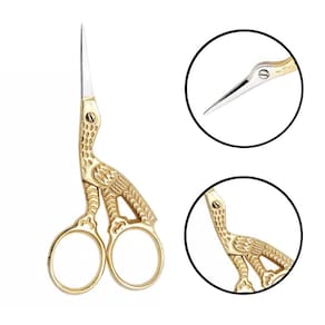 - Marca: Premax - Modelo: Tesoura de bordar - Referência: V71250312D - Contém 01 unidade - Cor: Ouro - Banhada em ouro 24k - Formato de uma cegonha - Tamanho: 9cm - Material: Aço - Fabricada na Itália