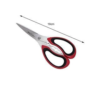 Tesoura culinária de metal com cabo plástico Cor: vermelho Tesoura com lâmina em aço inox para um desempenho de corte excepcional e duradoura, ainda possui cabo soft em plástico para um maior conforto evitando acidentes, e capa plástica protetora para as lâminas. As tesouras servem perfeitamente para destro ou canhoto. Lâminas altamente resistente à ferrugem e corrosão, de alta qualidade, precisas, afiadas e cuidadosamente ajustadas.