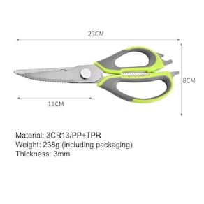 Tesoura de Cozinha Multiuso 6 em 1 ? Versatilidade e PraticidadeA Tesoura Multiuso é um utensílio indispensável para qualquer cozinha. Com design ergonômico e lâminas afiadas em aço inox, ela facilita diversas tarefas, tornando o preparo dos alimentos mais rápido e eficiente.Destaques:Multiuso: Ideal para cortar carnes, legumes, verduras, descascar alimentos e até abrir potes herméticos.Lâminas de Aço Inox: Alta durabilidade e resistência à corrosão.Cabo ergonômico: Produzido em polipropileno, proporciona conforto e segurança no manuseio.Design funcional: Conta com recursos adicionais como abridor de garrafas e quebra-nozes.Fácil de limpar: Pode ser lavada com esponja macia e detergente neutro. Especificações Técnicas:Material: Aço Inox e PolipropilenoCores disponíveis: Verde com CinzaDimensões:Largura: 8 cmComprimento: 23 cmA Tesoura Multiuso foi projetada para tornar sua vida mais prática e eficiente. Perfeita para quem busca qualidade e versatilidade na cozinha!