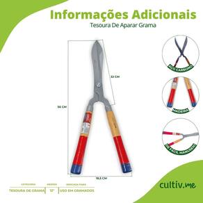 Características * Tipo: Tesoura para aparar grama * Marca: CORNETA * Tamanho: 12” * Material das lâminas: Aço carbono de alta resistência * Material do cabo: Madeira envernizada com pontas pintadas * Corte: Preciso * Uso indicado: Acabamento e arremate em gramados e jardins * Função: Corte manual de grama e vegetação rasteira