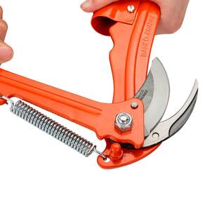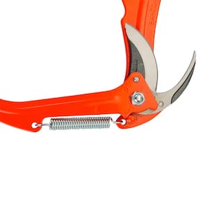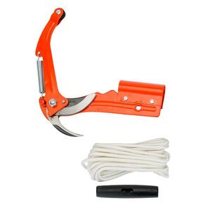 Tesoura de podar no ar com lâmina temperada. Contra lâmina estampada, temperada e com formato especial para melhor escoamento da seiva e outros resíduos. Suporte de fixação em aço, adequado a extensões telescópicas de 25 mm (1") de diâmetro. Fornecida com corda de 3 m.
