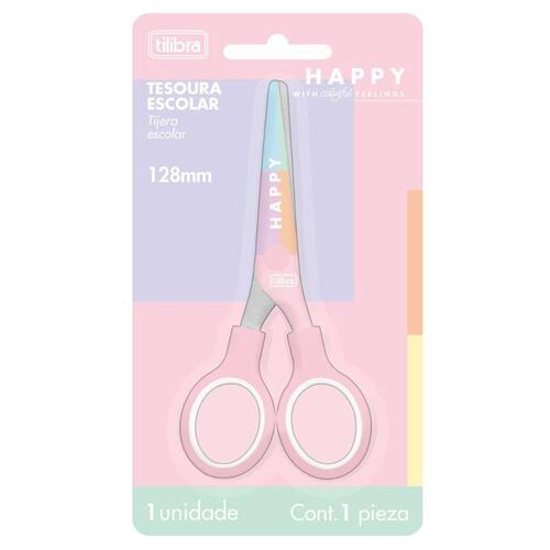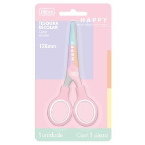 Tesoura Escolar 12,8cm Tilibra Happy A Tesoura Escolar 128mm Happy possui cabo em polipropileno e lâmina em aço inox decorada que garante sua durabilidade e personalidade, auxiliando o aluno em suas atividades diárias.
