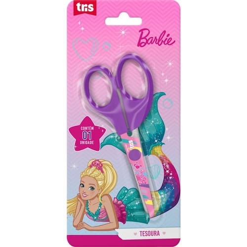 Com pontas arredondadas e cabo resistente em PP, a tesoura Barbie possui as lâminas decoradas, 13cm de comprimento total e 1,5mm de espessura de lâmina.