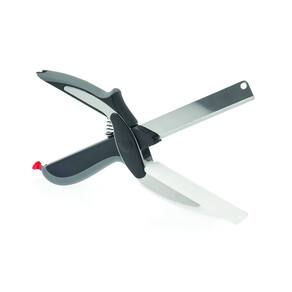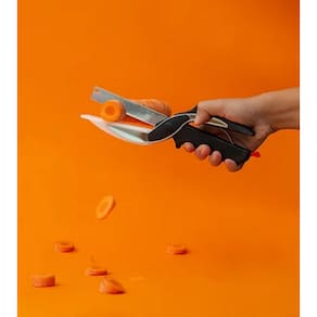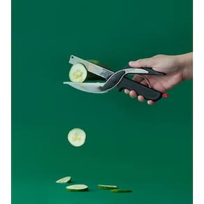 2 em 1 ela é tesoura e tábua de corte. você pode cortar, fatiar e picar os alimentos direto na panela, tigela ou prato.