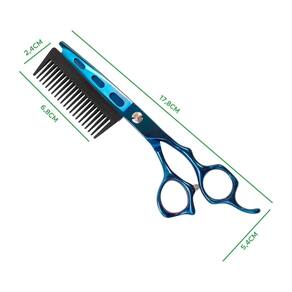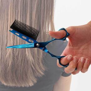 Tesoura de corte de cabelo com pente integrado, a ferramenta perfeita para um corte de cabelo preciso e eficiente em casa ou no salão. Com design ergonômico e lâminas afiadas em aço, essa tesoura oferece um corte suave e uniforme. Especificações Técnicas: - Pente Integrado - Lâminas de Aço - Fio navalha: possuem um corte convexo e extremamente afiado - Com parafuso ajustável - Design Ergonômico - Com apoio para os dedos - Cor: Azul vibrante com acabamento cromado - Versatilidade: e doméstico - Tamanho: 7 Polegadas - Dimensões pente: 2,4cm x 6,8cm - Dimensões tesoura: 5,4cm x 17,8cm