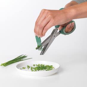 Tesoura para ervas aco inox vd 23cmx8cm Esta tesoura é perfeita para facilitar suas tarefas do dia a dia. Com ela, é possível picar e cortar os mais diversos tipos de ervas e até mesmo fatiar champignon. Suas lâminas produzidas em aço inox desempenham com eficiência o corte preciso, enquanto as alças em plástico com acabamento em silicone garantem um manuseio firme e seguro. Ainda conta com um prático pente em silicone com cerdas que se encaixam perfeitamente às lâminas, permitindo uma higienização rápida e impecável. Fabricada pela holandesa brabantia, marca com mais de 90 anos de tradição, reconhecida internacionalmente pela inovação e qualidade de seus produtos. Ficha técnica: Marca: brabantia Conteúdo da embalagem: 1 tesoura e 1 mini pente Material: aço inox e silicone Cor: verde Dimensões: 22,5cm x 2cm x 8cm axlxp Garantia: 3 meses - contra defeito de fabricação