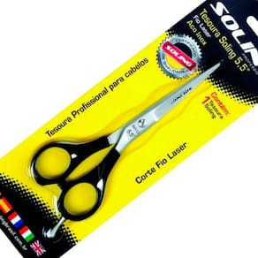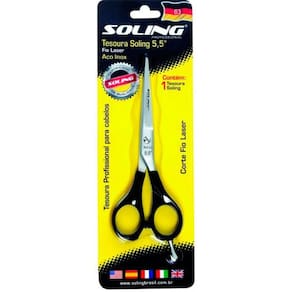 Tesoura Profissional Soling Fio Laser Prata 5.5 Polegadas Tesoura Profissional Soling Fio Laser Prata Tesoura Profissional Soling Fio Laser Prata Produto fábricado na Alemanha na região de Solingem, conhecida como "Cidade das lâminas"; Fio laser de um lado; Fio Navalha outro lado; Material Aço Inox; Corte Preciso; Ref: 63.