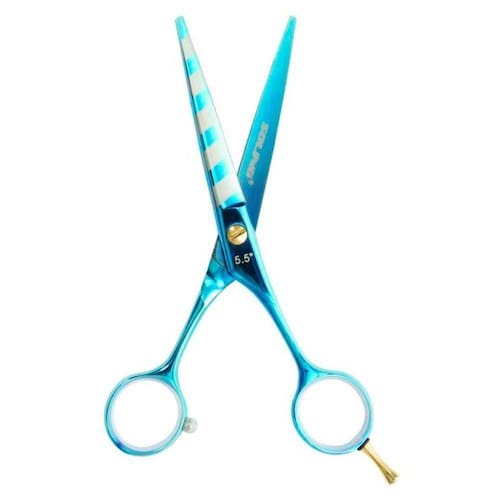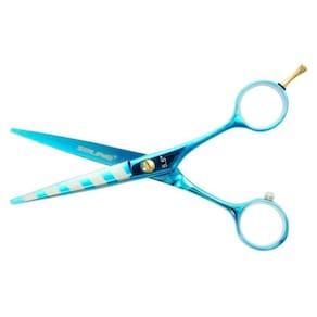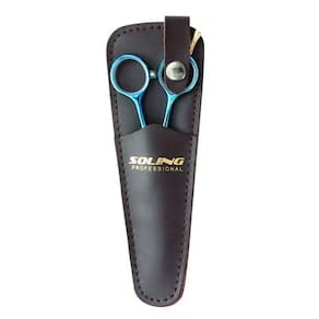 Acompanha o produto: - 01Tesoura Profissional Fio Navalha 5.5 Azul Com Listras - 01 Estojo de couro.