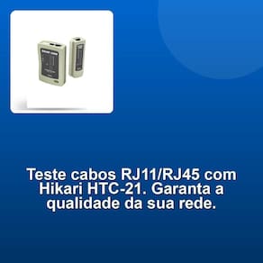 Testador Cabo De Rede Hikari Rj11/rj45 Htc-21 Aqui está a descrição do produto estruturada e persuasiva: O Testador Cabo De Rede Hikari Rj11/ Rj45 Htc-21 21I537 é um instrumento essencial para medir a frequência ou intensidade de dados transmitidos pelo cabo. Com um display de LED indicador de resultados, pode testar automaticamente cabos RJ45 e RJ11 com facilidade e rapidez.