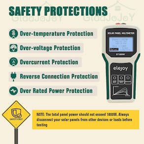 - ?Várias proteções de segurança?Nosso multímetro solar é embalado com várias proteções de segurança, incluindo proteções de sobretensão, superaquecimento, sobrecorrente e sobrecarga, garantindo que você possa trabalhar com confiança. Ele vem com dois cabos MC4 longos e dois cabos de clipe jacaré, tornando-o versátil para várias necessidades de conexão. (Importante: a potência total do painel não deve exceder 1800W. Sempre desconecte seus painéis solares de outros dispositivos ou cargas antes de testar!)