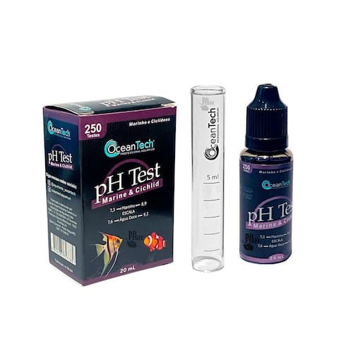 01x Escala Colorimétrica. O Ocean Tech Teste de pH Marinho e Ciclídeos 20ml 250 Testes é uma solução prática e de alta precisão para medir o pH da água de aquários marinhos e de ciclídeos, garantindo que os níveis de acidez ou alcalinidade estejam dentro da faixa ideal para a saúde e bem-estar dos seus peixes e plantas aquáticas. O teste é simples de usar: basta adicionar o reagente à água, esperar alguns minutos e comparar a cor obtida com a tabela de cores fornecida para determinar o valor do pH.