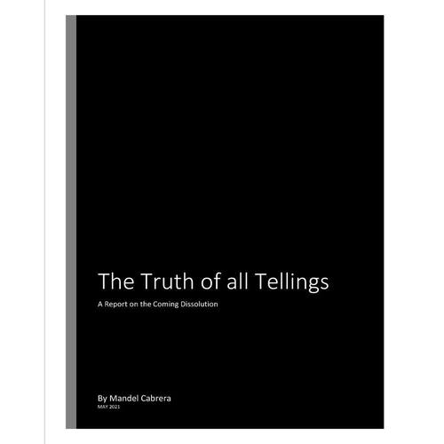 The Truth of all Tellings: where humankind is plagued by Tellings of all kinds. An account of the Plague of all Tellings, when all tales of the world and of all origins come true, when all narratives of creation become authentic. Can the center hold? The explanation of all Tellings, of the Plague, are philosophically comical. The Plague is never explicitly identified, but you recognize how it makes you feel, at the edge of some precipice where This or That are both true.