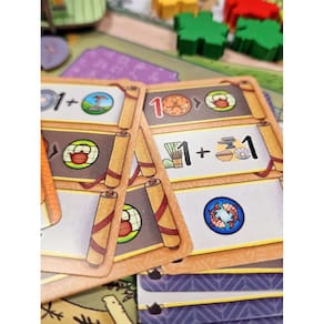 Conteúdo: 39 cartas, 4 peças de pátio de treinamento, 10 peças de cerimónia, 8 peças de nenúfar, 4 peças +120/+160, moedas de 1 iene, moedas de 5 ienes, 1 ponte verde, 5 dados verdes, 5 geishas em cada uma das 4 cores, 4 cubos de chasen, 4 tabuleiros de domínio pessoal, 1 extensão para o tabuleiro principal e manual