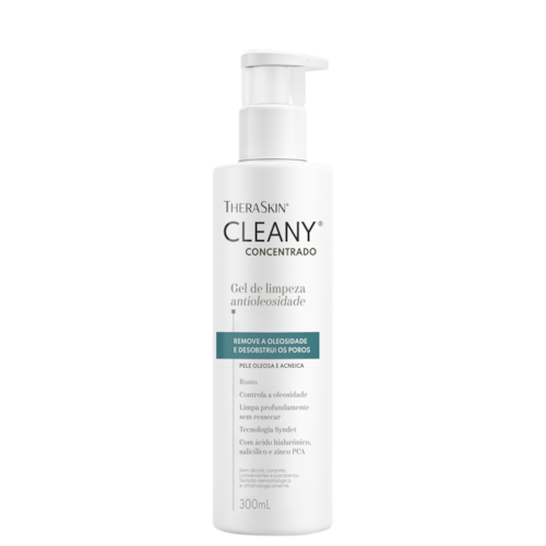 Gel de limpeza facial para peles oleosas a acneicas. TheraSkin Cleany Concentrado limpa e hidrata a pele, removendo sujidades sem ressecar.