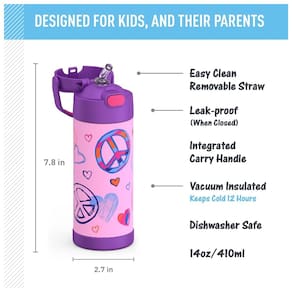 É uma garrafa térmica fácil para a criança abrir através do sistema de abertura com mão única e o canudo em silicone macio que acompanha o produto proporcionando conforto na hora de beber, além da alça de transporte integrada ao produto com design leve e compacto, perfeita para todas as ocasiões.