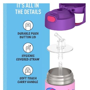 Thermos Garrafa Térmica Infantil com simbolo da Paz e Alça Roxa 355ml Considerada internacionalmente a melhor Garrafa Térmica Infantil, pela qualidade, segurança, design e custo-benefício. A Garrafa Térmica Thermos Funtainer é o jeito mais leve e divertido de manter as crianças hidratadas o dia todo. É alegria garantida para pais e crianças. Ideal para manter a temperatura perfeita de água, sucos e outras bebidas por até 12 horas. É uma garrafa térmica fácil para a criança abrir através do sistema de abertura com mão única e o canudo em silicone macio que acompanha o produto proporcionando conforto na hora de beber, além da alça de transporte integrada ao produto com design leve e compacto, perfeita para todas as ocasiões. Uma garrafa para crianças, leve, resistente a quedas e não transpira por fora já que é feita parede dupla de aço inoxidável, tecnologia de isolamento a vácuo pioneira e patenteada pela Thermos. Ela irá acompanhar o seu filho em todas as fases do seu desenvolvimento, sendo um parceiro de grande momentos. Além disso, é segura para as crianças porque a tampa e o canudo são BPA Free, que significa plástico livre de BPA Bisfenol A . Por isso não libera substância tóxica no contato com temperaturas elevadas, como colocar em máquina lava-louças ou limpar com água quente, sendo extremamente seguro e higiênico. Inclusive, a tampa é cambiável e, conforme as fases de desenvolvimento da criança, pode ser adaptada e modificada. ESPECIFICAÇÕES TÉCNICAS Material: Aço inoxidável e plástico BPA Free livre de Bisfenol A Retenção para frio: 12 horas Capacidade: 410 ml Dimensões AxLxP : 21 cm x 7cm 7xcm Marca: Não Informado Ean: 041205766315