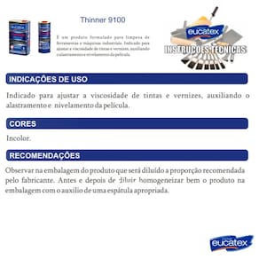 Mantenha fora do alcance de crianças e longe de fontes de calor ou chamas.Armazene em local fresco e seco, protegido da luz solar direta.Use equipamentos de proteção, como luvas e máscara, ao manusear o produto.Adquira o Thinner 5 Litros 9100 Eucatex e tenha a garantia de uma limpeza eficiente e uma diluição perfeita para todos os seus projetos!