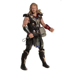Apresentando um retrato incrivelmente realista do ator Chris Hemsworth, Thor veste seu traje mais recente do Mundo das Trevas e vem completo com seu poderoso martelo Mjolnir.