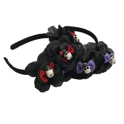 Contém: 01 Tiara com Mini Caveiras para Fantasia de Halloween (pode variar as cores entre roxo e vermelho)