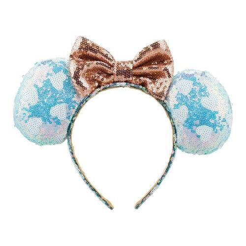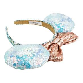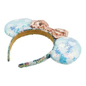 Tiara com orelhas da Minnie na cor azul e laçinho característico da ratinha da Disney na cor rosê, ambos revestidos de lantejoulas brilhantes. Material: poliéster e plástico Peso (Kg) 7.00 Altura (cm) 20.00 Largura (cm) 25.00