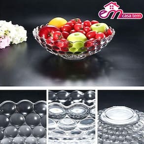 O design da tigela é marcado por desenhos em formato de bolha, conferindo um visual elegante à peça. A base estável proporciona segurança durante o uso, e a transparência do vidro valoriza a apresentação dos alimentos. A tigela pode ser utilizada como centro de mesa, acomodando frutas ou outros elementos decorativos. Sua limpeza é fácil e prática, tornando-a uma opção conveniente para o dia a dia.