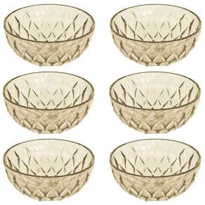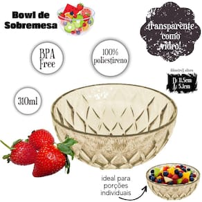 Kit com 6 tigelas de plástico para sobremesa com capacidade para 310ml. Produto integrante da linha Cristal Glamour, possui superfície facetada, seguindo as principais tendências do segmento de mesa posta e decoração. Produto versátil, possibilita infinitas produções casual ou chique. É produzido em material atóxico e livre de BPA.