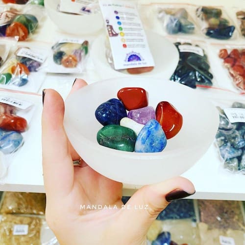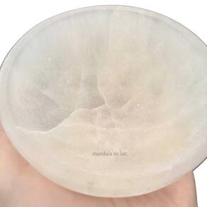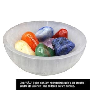 Selenita para limpeza e Kit dos chakras - Cristal - Vibrações - Meditação - Limpeza Emitimos Nota Fiscal Eletrônica para todos os Produtos. Atenção: a tigela contém rachaduras que é da própria pedra de Selenita, não se trata de um defeito. Altura média da tigela: 4cm Largura média da tigela: 10cm Peso médio da tigela 280 a 320 gramas Tamanho médio das pedras dos chakras: 2 à 4cm Peso médio do kit dos chakras: 100 a 150 gramas Dica: Deixe os cristais dentro da tigela para que a selenita limpe os cristais. Por se tratar de pedras, podem ocorrer pequenas variações no formato e na tonalidade. Foto demonstrativa do lote. Pedras do kit: Ametista, Sodalita, Quartzo Azul, Quartzo Verde, Citrino queimado, Cornalina e Jaspe vermelho. Um pouco sobre a Selenita, conforme o livre: o caminho das pedras: Uma função muito importante é a limpeza e energização simultânea de outras pedras, objetos, e até mesmo de pessoas ou ambientes. Com sua ajuda, uma pessoa pode perceber mais claramente os aspectos mais profundos de qualquer situação, compreendendo melhor tanto o que está na superfície quanto o que está no fundo. Ajuda a remover bloqueios energéticos em qualquer parte da coluna. A selenita é um importante instrumento para ativar os chakras transpessoais, situados acima da cabeça. Através desses chakras, recebe-se a energia da mais pura luz do espírito. A selenita é uma pedra muito sensível, deve-se procurar não dar espaço para pensamentos ou atitudes negativas enquanto se trabalha com ela, pois pode se quebrar. Esse mineral também apresenta propriedades de solubilidade, e por isso, não deve ser deixado em contato com a água. Não há necessidade de limpeza.
