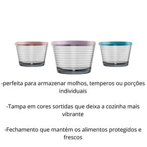 A Tigela de Vidro Ginga 145ml com Tampa Cor é a escolha ideal para armazenar pequenas porções com praticidade e estilo. Com capacidade de 145ml, é perfeita para servir molhos, patês, sobremesas individuais, temperos ou snacks, mantendo os alimentos frescos por mais tempo. Produzida em vidro resistente e higiênico, não retém odores nem manchas, garantindo maior durabilidade e preservação da qualidade. A tampa colorida e funcional assegura um fechamento eficiente, evitando vazamentos e facilitando o transporte. Compacta e versátil, é ideal para uso diário, organização e praticidade na cozinha. Especificações: - Marca: Nadir; - Modelo: 3256; - Com Tampa: Sim; - Capacidade: 145ml; - Diâmetro: 6,5 cm; - Dimensões: 8 x 8 x 6 cm; - Material: Vidro, Plástico; - Recomendações: A tampa não deve ser exposta a altas temperaturas forno ou micro-ondas ; - : 3 meses 90 dias . Conteúdo da embalagem: -01 Tigela de Vidro Ginga 145ml com Tampa Cor . Marca: Não Informado