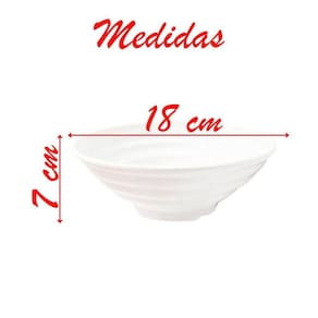 Tigela em melamina, um tipo de plástico duro com maior qualidade, durabilidade e resistência, lavagem e principalmente transporte, pois garante a segurança do usuário em possíveis quebras ou lascas. Essas características fazem da melamina um material bem popular, como muitos plásticos, a melamina não deve ser levada ao micro ondas, devido ao risco de danificar o material e o perigo de vazamento de toxinas para o alimento.